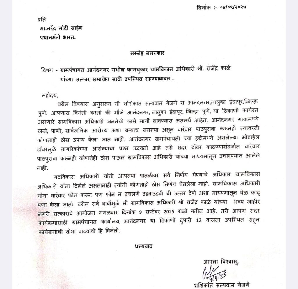 विशेष बाब म्हणजे या कार्यक्रमासाठी देशाचे पंतप्रधान नरेंद्र मोदी यांनाही पत्राद्वारे गेजगे यांनी निमंत्रण पाठवून उपस्थित राहण्या संदर्भात विनंती केली आहे. आनंदनगर गावातील नागरिक, सामाजिक कार्यकर्ते, सर्व राजकीय पक्षाचे नेते, ग्रामपंचायत सदस्य, पत्रकार बांधव यांच्या उपस्थिती मध्ये मंगळवार दिनांक ९ सप्टेंबर रोजी दुपारी १२ वाजता, ग्रामपंचायत कार्यालय आनंदनगर ता. इंदापूर, जि. पुणे येथे ग्रामविकास अधिकारी राजेंद्र काळे यांचा जाहीर सत्कार करण्यात येणार आहे असे शशिकांत गेजगे यांच्याकडून सांगण्यात आले आहे.
