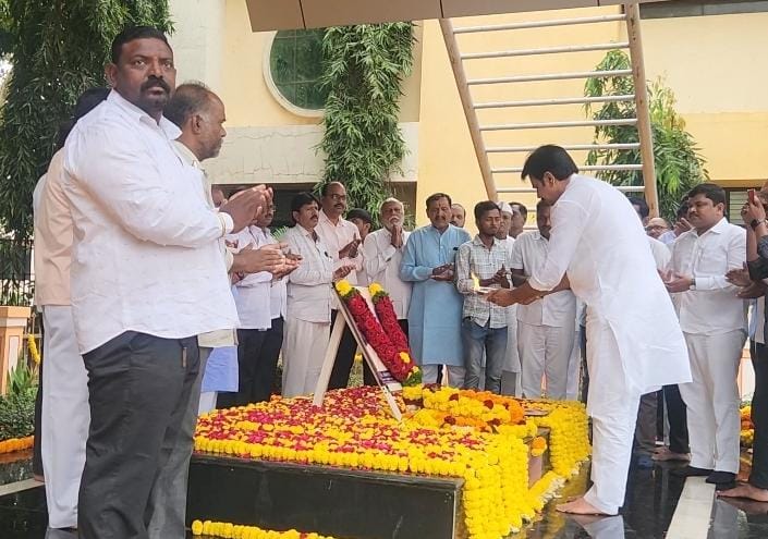 इंदापुर : माजी खासदार कर्मयोगी शंकरावजी बाजीराव पाटील यांच्या १९ व्या पुण्यतिथीनिमित्त राष्ट्रीय सहकारी साखर कारखान्याचे अध्यक्ष व माजी मंत्री हर्षवर्धन पाटील यांनी इंदापूर येथील कला, विज्ञान आणि वाणिज्य महाविद्यालयातील कर्मयोगी शंकरराव पाटील यांच्या समाधी स्थळाचे दर्शन घेऊन त्यांना अभिवादन केले.