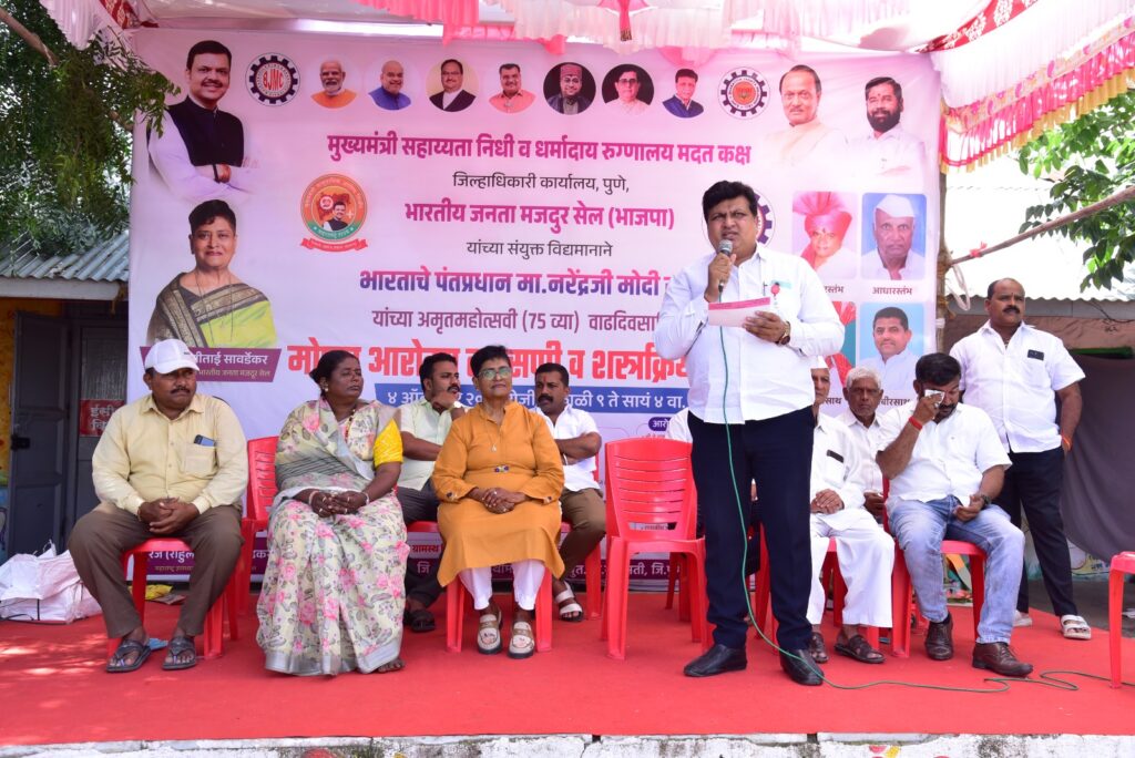 पुणे: (ता.०७) पंतप्रधान नरेंद्रजी मोदी यांच्या अमृतमहोत्सवी वाढदिवसानिमित्त, मुख्यमंत्री सहायता निधी व धर्मादाय रुग्णालय मदत कक्ष, जिल्हाधिकारी कार्यालय पुणे आणि भारतीय जनता मजदूर सेल यांच्या संयुक्त विद्यमाने मौजे निंबुत (ता. बारामती, जि. पुणे) येथे भव्य मोफत आरोग्य तपासणी व शस्त्रक्रिया शिबिर भव्यदिव्य पद्धतीने पार पडले.