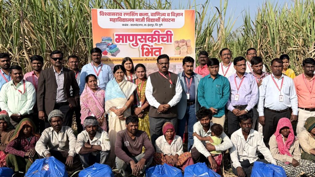 वालचंदनगर :(ता.१०) इंदापूर तालुका ग्रामविकास प्रतिष्ठानचे विश्वासराव रणसिंग महाविद्यालय कळंब ता.इंदापूर माजी विद्यार्थी संघटना यांच्यावतीने माणुसकीची भिंत उपक्रमांतर्गत ऊसतोड मजूर कामगारांना जीवनावश्यक वस्तूंचे वाटप संस्था अध्यक्ष आनंदी रणसिंग यांच्या हस्ते करण्यात आले.निमसाखर परिसरातील बोंद्रे वस्ती येथील ऊसतोड मजूर कामगारांना जीवनावश्यक वस्तूंचे वाटप करण्यात आले.