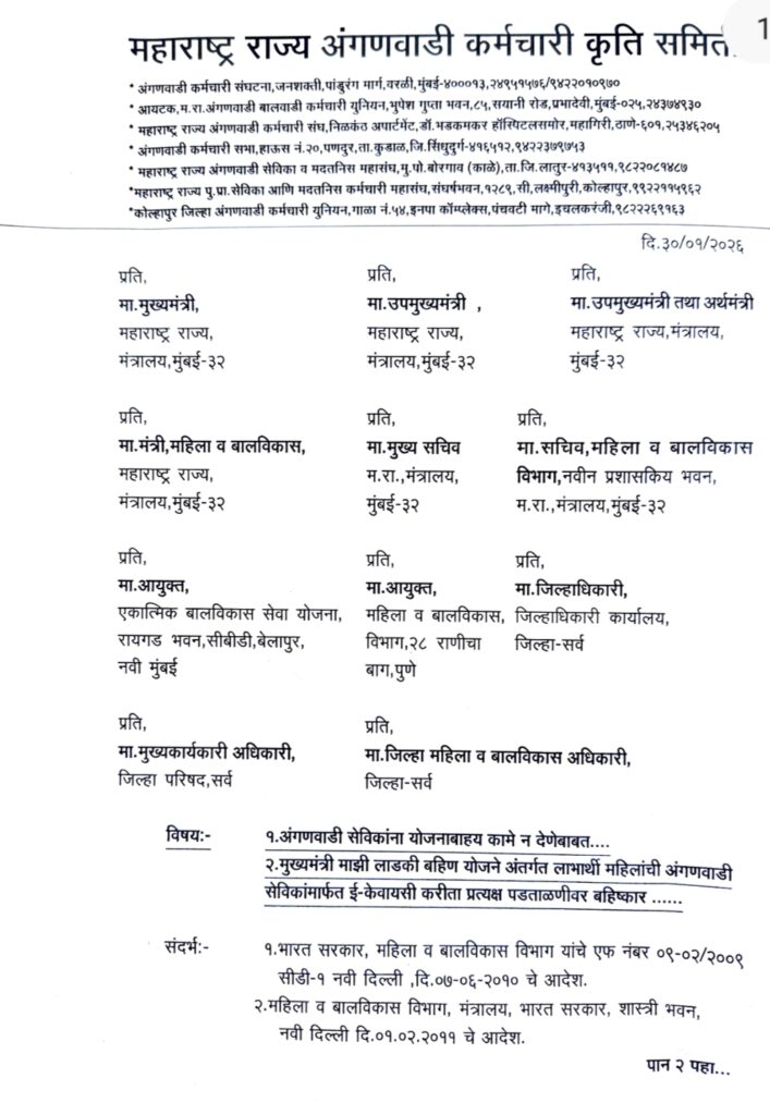 भवानीनगर:( ३१) अंगणवाडी सेविकांना योजनाबाह्य कामे देऊ नयेत व मुख्यमंत्री माझी लाडकी बहीण योजनेअंतर्गत लाभार्थी महिलांचे अंगणवाडी सेविका मार्फत ई-केवायसी करिता प्रत्यक्ष पडताळणीवर महाराष्ट्र राज्य अंगणवाडी कर्मचारी कृती समिती यांच्यामार्फत ब्रुजपान सिंह, दिलीप उटाणे,शुभा शमीम,कमळ परूळेकर, भगवान देशमुख, जयश्री पाटील, जीवन सूरूडे यांनी मुख्यमंत्री, उपमुख्यमंत्री, अर्थमंत्री, महिला व बाल विकास मंत्री, मंत्रालयातील मुख्य सचिव, महिला व बाल विकास विभाग सचिव, एकात्मिक बालविकास सेवा योजना आयुक्त, पुणे आयुक्त महिला व बालविकास विभाग, सर्व जिल्हाधिकारी, मुख्य कार्यकारी अधिकारी, प्रत्येक जिल्ह्यातील जिल्हा महिला व बालविकास अधिकारी सर्व विभागीय उपआयुक्त महिला व बालविकास विभाग सर्व, मुख्याधिकारी जिल्हा परिषद , जिल्हा कार्यक्रम अधिकारी महिला व बाल विकास विभाग जिल्हा परिषद , बालविकास प्रकल्प अधिकारी ग्रामीण ,नागरी ,शहरी, आदिवासी, यांना याबाबत निवेदन पाठवण्यात आलेले आहे.