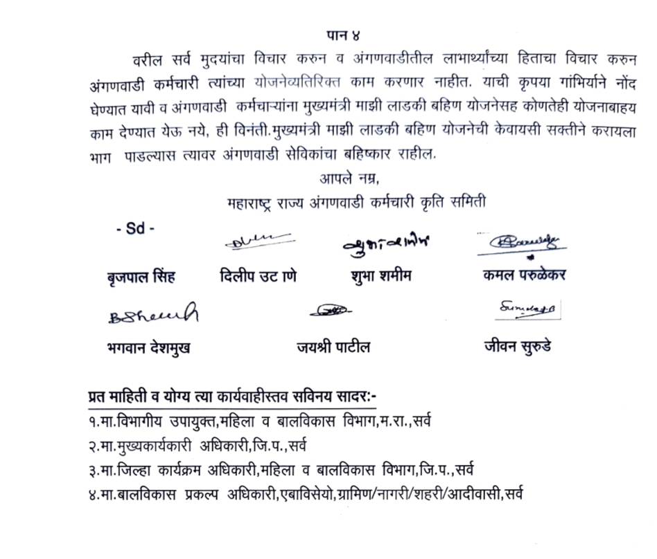 त्यातच अधिकचा भार म्हणून मुख्यमंत्री माझी लाडकी बहीण योजनेसह कोणतीही योजना बाह्य काम देण्यात येऊ नये मुख्यमंत्री माझी लाडकी बहीण योजनेची केवायसी सक्तीने करायला भाग पाडल्यास त्यावर अंगणवाडी सेविकांचा बहिष्कार राहील असे निवेदनात नमूद केले आहे.