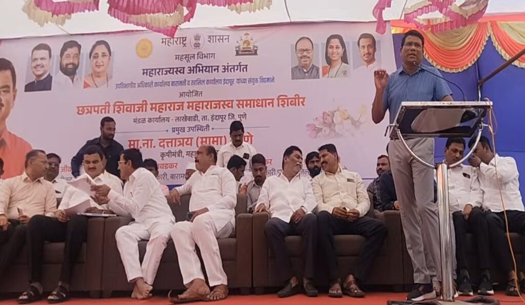 इंदापूर : लाखेवाडी (ता.इंदापुर) येथे छत्रपती शिवाजी महाराज महाराजस्व समाधान शिबिराचे आयोजन करण्यात आले होते.इंदापुर तालुक्याचे आमदार व कृषी मंत्री दत्तात्रय भरणे यांच्या प्रमुख उपस्थितीत या शिबिराचे आयोजन करण्यात आले होते.यावेळी जिल्हा परिषद सदस्य श्रीमंत ढोले, जिल्हा परिषद माजी सदस्य प्रताप पाटील,प्रांताधिकारी वैभव नावडकर, तहसीलदार जीवन बनसोडे यांच्या सह अनेक राजकीय, सामाजिक व प्रशासकीय मान्यवर उपस्थित होते.